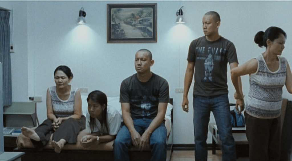 Specifically, the part that I am drawn to for comparison is the last shot of Uncle Boonme. As Jen sits with Tong (both characters who were with Boonmee prior to his death) and Jen’s friend Roong, the three set out to leave the room. As they do, Tong turns back and sees versions of themselves still sitting on the bed they just stood up from.